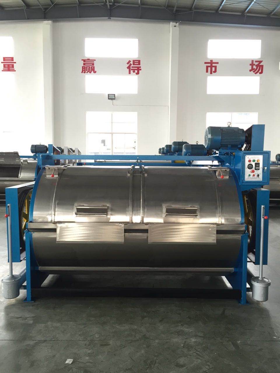 水洗機(jī):按容量大小分為:15kg、30kg、50kg、70kg、100kg、150kg、200kg等系列。該設(shè)備是滾筒型,內(nèi)、外殼采用優(yōu)質(zhì)不銹鋼制作而成,平整光滑、耐腐蝕、不損傷織物。該機(jī)由內(nèi)筒、外筒、電機(jī)、支撐總成、傳動(dòng)總成、電器總成組成。結(jié)構(gòu)合理、安裝使用方便。工作原理:由頂置電機(jī)、三角膠帶、帶動(dòng)傳動(dòng)總成,使內(nèi)筒作正反轉(zhuǎn)運(yùn)轉(zhuǎn),通過織物與織物、織物與內(nèi)筒壁的相互摩擦,達(dá)到洗滌效果。機(jī)器內(nèi)置過熱、過載裝置、定時(shí)裝置、正反轉(zhuǎn)控制裝置。外筒門設(shè)有安全裝置,若運(yùn)行中門被打開,機(jī)器立即停止運(yùn)轉(zhuǎn),確保機(jī)器、操作人員的安全。